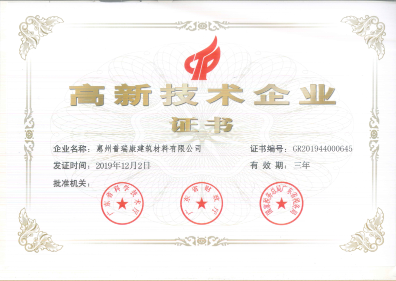 喜訊—惠州普瑞康建筑材料有限公司貨“高新技術企業”認定!喜報!!! 根據廣東省《高新技術企業認定管理辦法》和《高新技術企業認定管理工作指引》的相關規定,惠州普瑞康建筑材料有限公司于2019年12月2日被認定為高新技術企業!公司已于近日收到了由廣東省科學技術廳、廣東省財務廳、國家稅務總局廣東省稅務局“高新技術企業”認定證書,由此正式邁入高新技術企業行列!